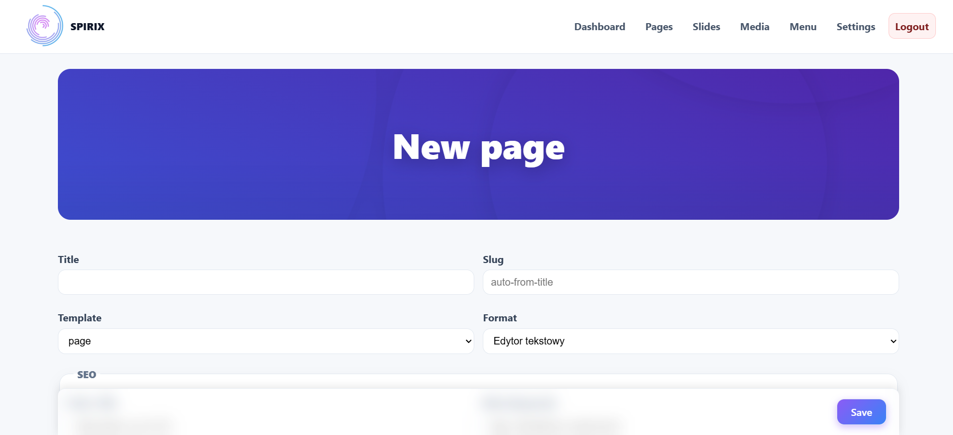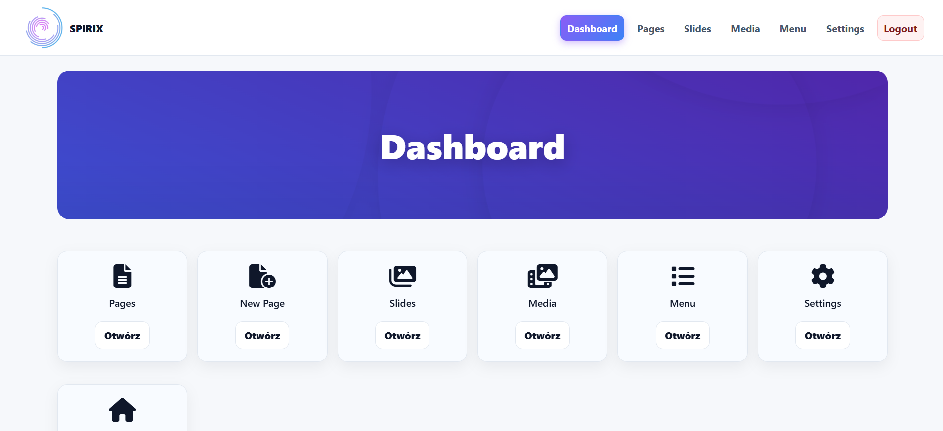 SPIRIX CMS to autorski system zarządzania treścią (CMS) zaprojektowany z myślą o tworzeniu niewielkich, nieskomplikowanych witryn internetowych. Wykorzystuje architekturę flat file, dzięki czemu do przechowywania treści nie wymaga tradycyjnej bazy danych – wszystkie dane strony zapisywane są bezpośrednio w plikach. Baza danych wykorzystywana jest wyłącznie do obsługi mechanizmu logowania do panelu administracyjnego, co znacząco upraszcza konfigurację i poprawia wydajność.