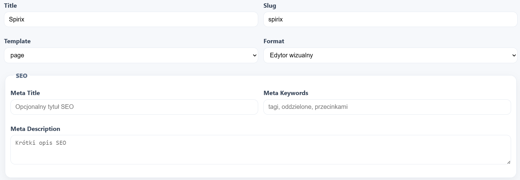 SPIRIX CMS sprawdza się idealnie w przypadku prostych stron informacyjnych, małych serwisów firmowych czy landing page’y. Został stworzony w celu zapewnienia maksymalnej szybkości działania, lekkiej struktury oraz intuicyjnej obsługi, bez zbędnych funkcjonalności obciążających system.